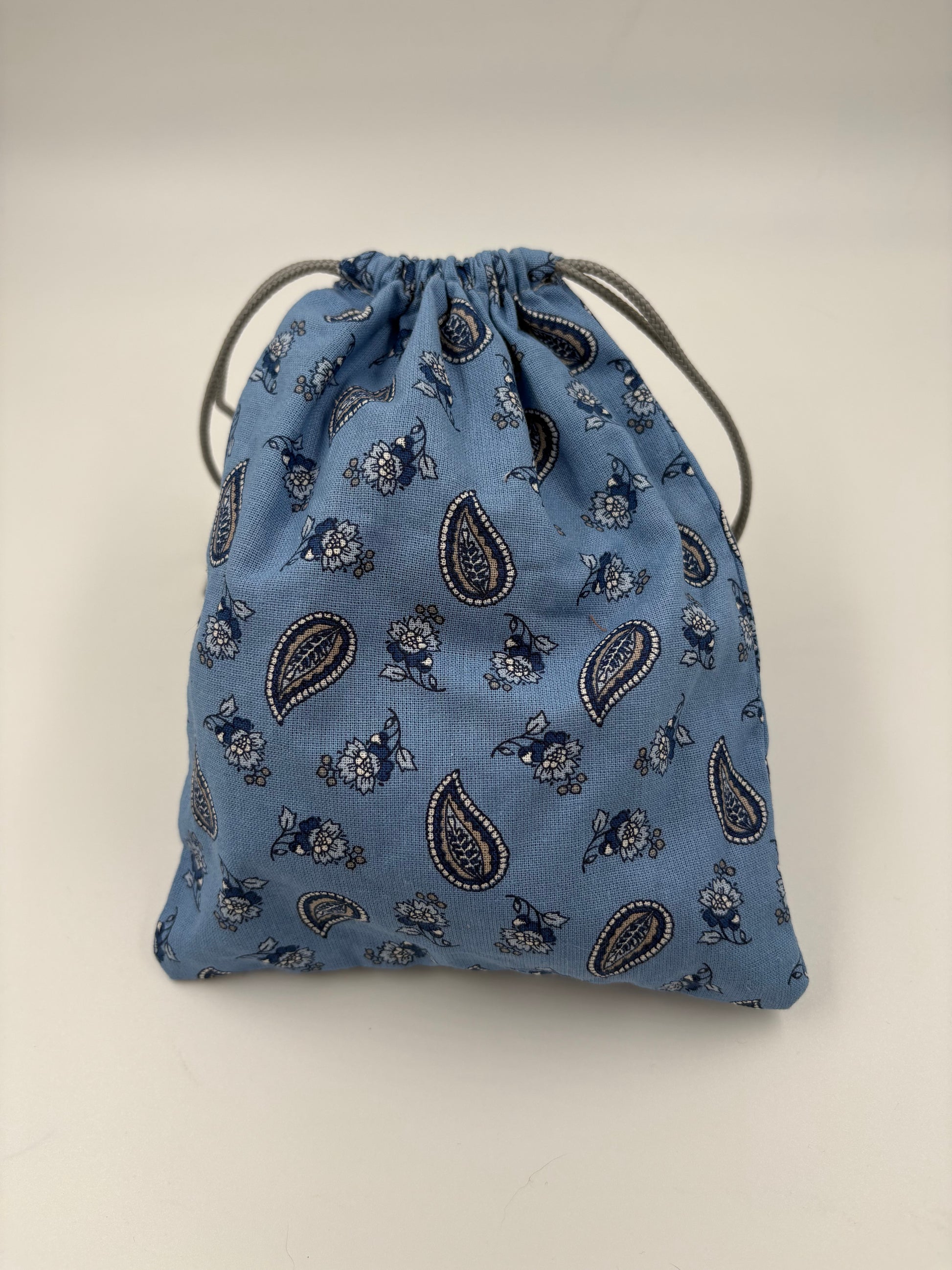 Le POCHON est en tissu coton motif et uni (dimensions 25 x 15 cm) avec un cordon (50 cm de long, 3 mm de diamètre) de couleur assorti.